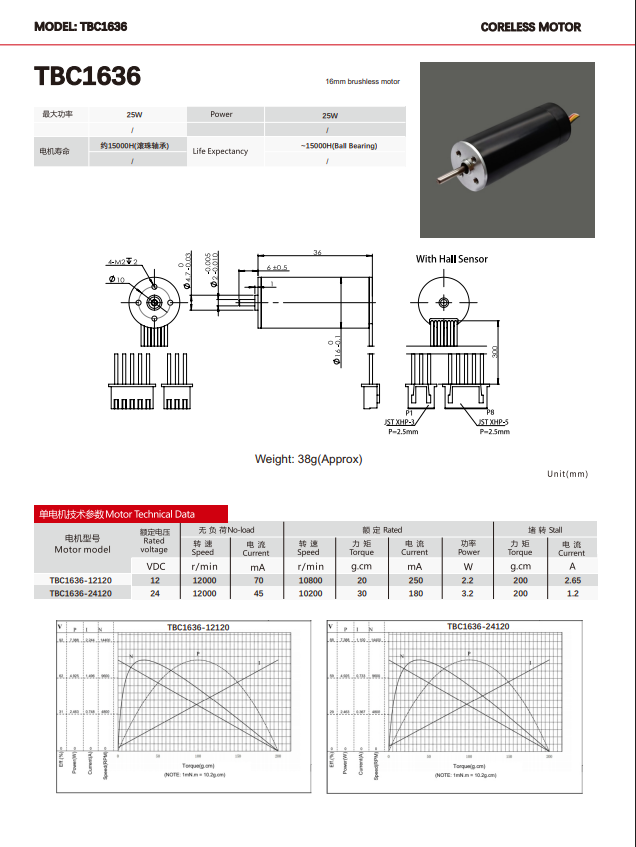 The diameter is only 16mm, the weight is <40g, and the power density is as high as 0.5W/g, which is suitable for space-constrained scenarios (such as micro robot finger joints, endoscope steering modules).